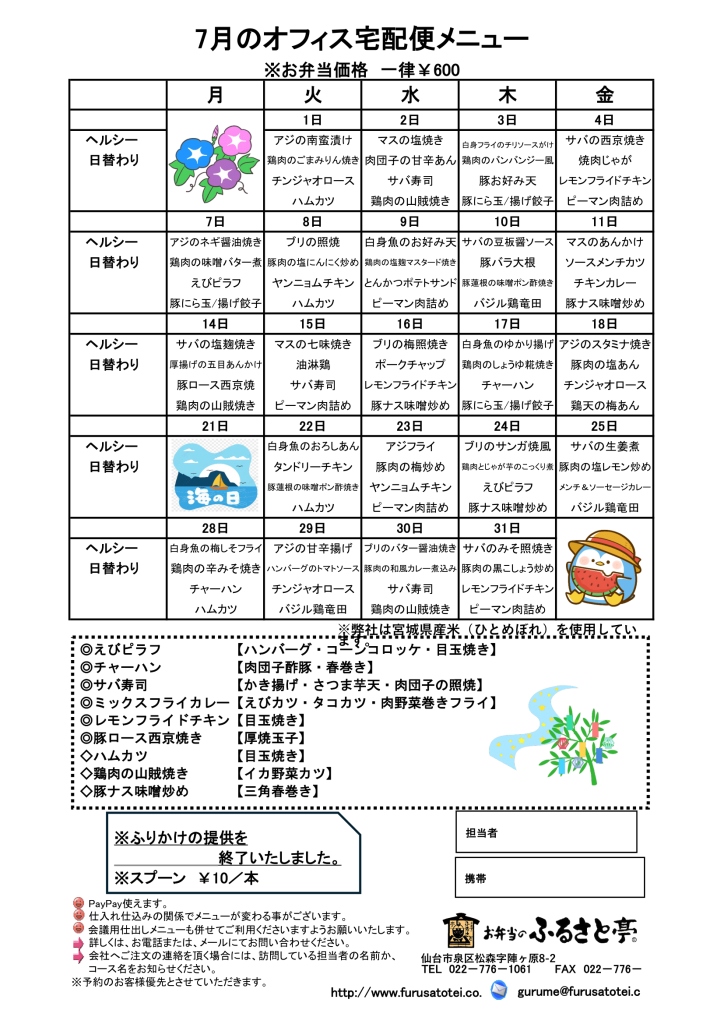 7月のオフィス宅配便メニュー表をお知らせ致します。