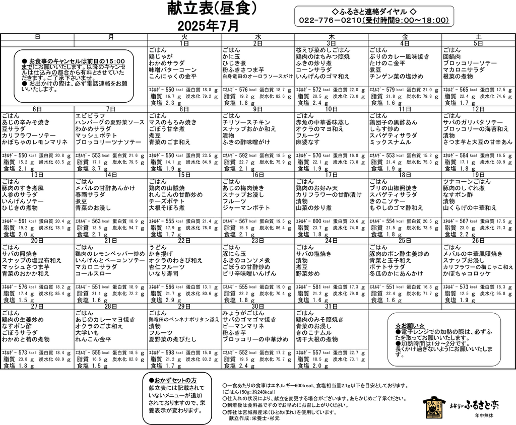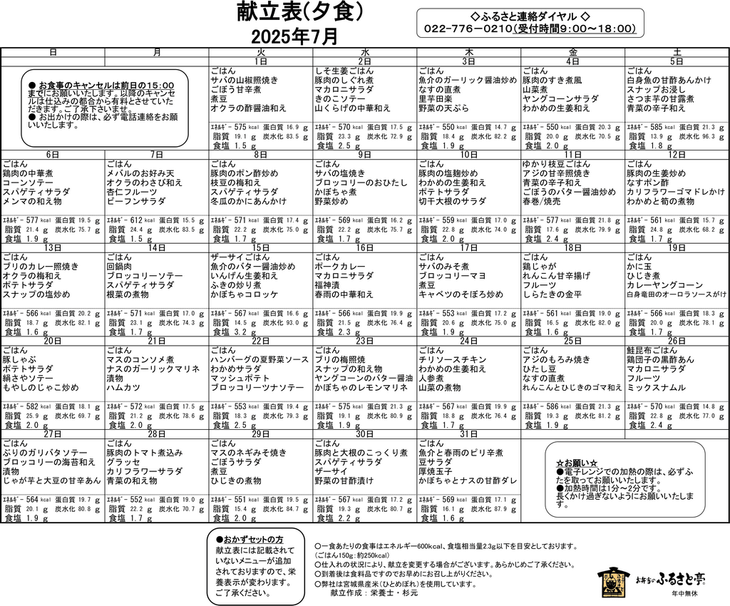 7月の高齢者配食の献立をお知らせ致します。