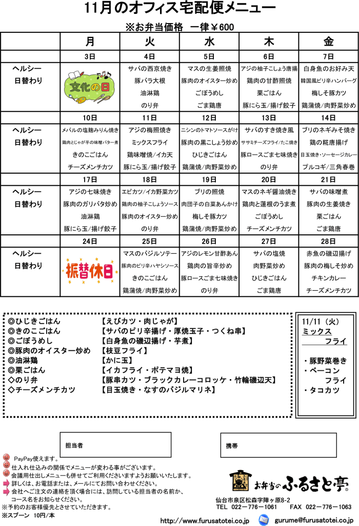 11月のオフィス宅配便メニュー表をお知らせ致します。