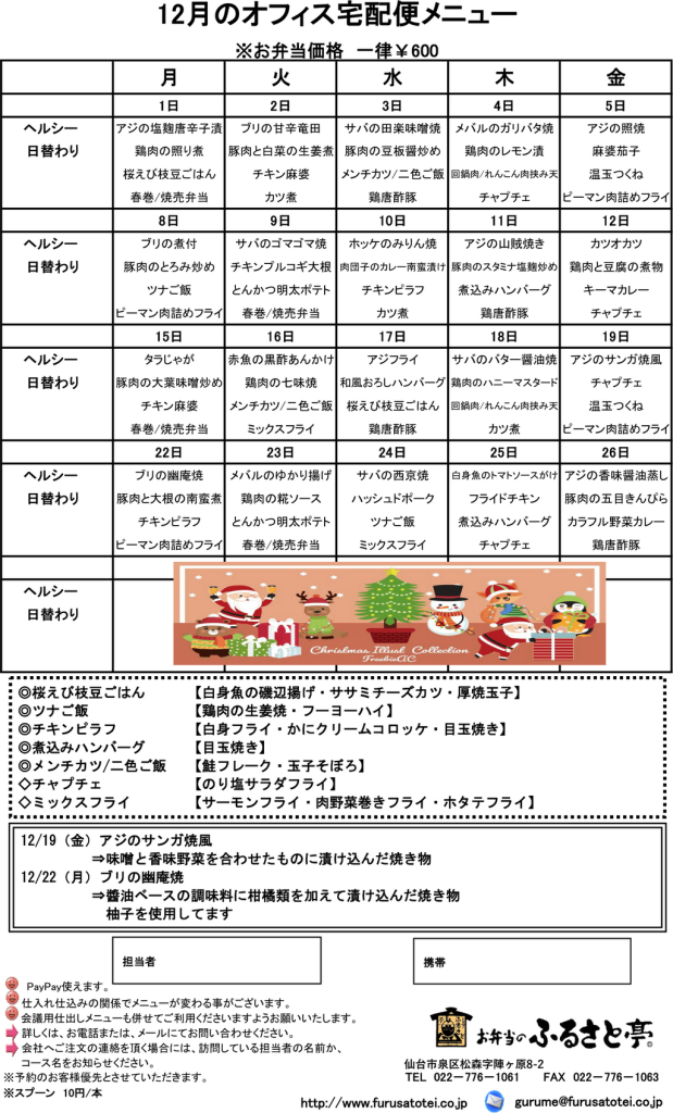 12月のオフィス宅配便メニュー表をお知らせ致します。